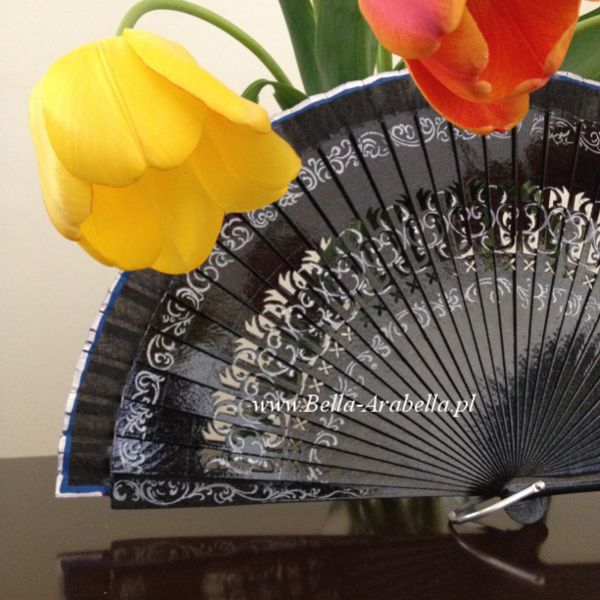 Drewniany stelaż z ozdobnymi wycięciami i dwustronną aplikacją z delikatnym białym, granatowym (lub odcieniami niebieskiego) akcentem, złączony jest "srebrnym" wygiętym (gładkim) złączem - umożliwiającym trzymanie wachlarza jednym palcem (właśnie za tę metalową rączkę) lub dorobienie do niego bransoletki na rękę.