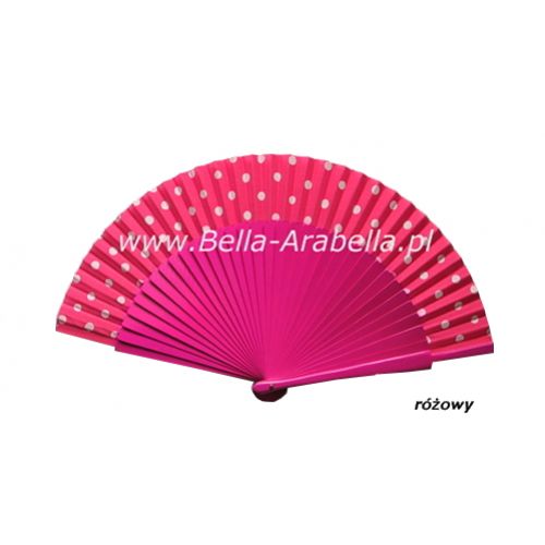 4) różowym (ZAREZERWOWANY) (po 1 szt) po 24 zł - głównie mają miejscowo rozmazane/odciśnięte niektóre kropki, co jest wynikiem zbyt szybkiego złożenia wachlarza przed wyschnięciem białej farby i/lub mogą mieć inne delikatne niedoskonałości na stelażu i/lub tkaninie;
